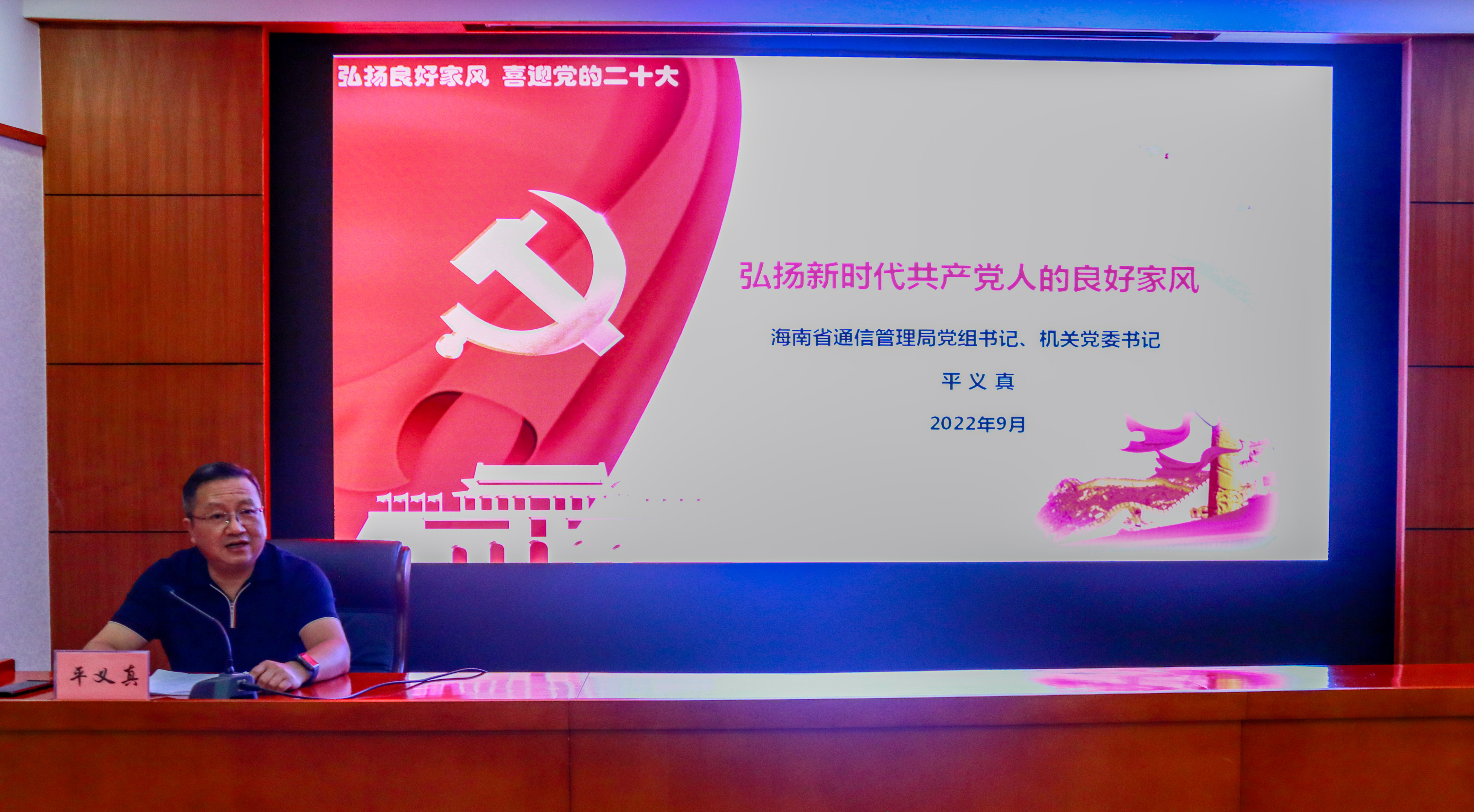 9月2日,海南省通信管理局组织开展“弘扬良好家风 喜迎党的二十大”主题党日活动,局党组书记、机关党委书记、局长平义真以“弘扬新时代共产党人的良好家风”为题,为全体党员干部职工讲授了一场主题鲜明、内涵丰富、形象生动的专题党课。