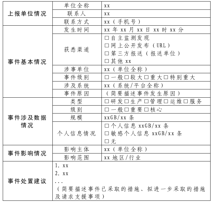 注:1.涉及系统、影响主体和范围等信息不明确的,可填“尚不明确”。