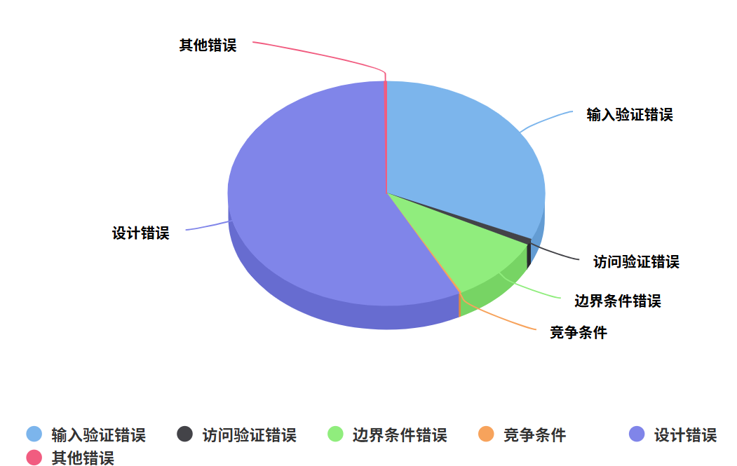 从漏洞产生原因来分类,其中设计错误占比为57.3%,输入验证错误占比为31.8%,边界条件错误占比为9.6%,访问验证错误占比为0.9%,竞争条件占比为0.2%,具体情况如图5所示。