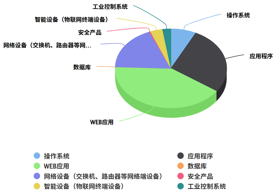 从漏洞影响对象类型来分类,其中影响WEB应用占比为40.8%,影响应用程序占比为27.4%,影响网络设备(交换机、路由器等网络端设备)占比为18.1%,影响操作系统占比为7.4%,以及智能设备(物联网终端设备)占比为3.6%,工业控制系统占比为2.4%等具体情况如图9所示。