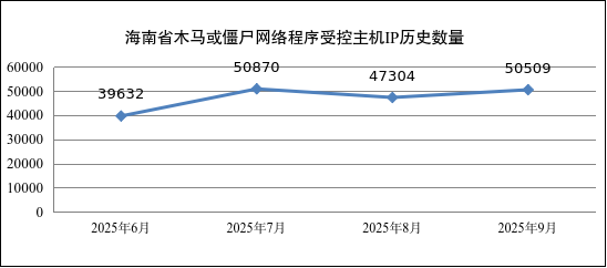 2025年9月,共监测发现境内木马或僵尸程序受控制主机数为4540271个,与上月的4508952个相比增长了0.69% ,其中海南省的IP共有50509个,排全国第26位,占总数的1.11%,历史数量如图1所示。