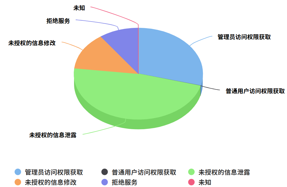 从漏洞引发的威胁来分类,其中未授权的信息泄露占比为47.7%,管理员访问权限获取占比为29.2%,未授权的信息修改占比为13.2%,拒绝服务占比为9.8%,,具体情况如图6所示。