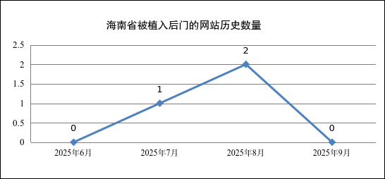 2025年9月,共监测发现我国大陆地区2324个网站被植入后门程序,比上月的2762个下降了15.86%,其中,海南省0个,历史数量如图3所示。