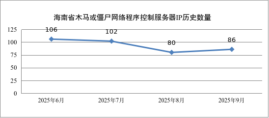 2025年9月,共监测发现我国大陆地区24234个IP地址对应的主机被利用作为木马控制服务器,与上月的24949个相比下降了2.87%,其中海南省的IP共有86个,排全国第28位,占总数的0.35%,历史数量如图2所示。