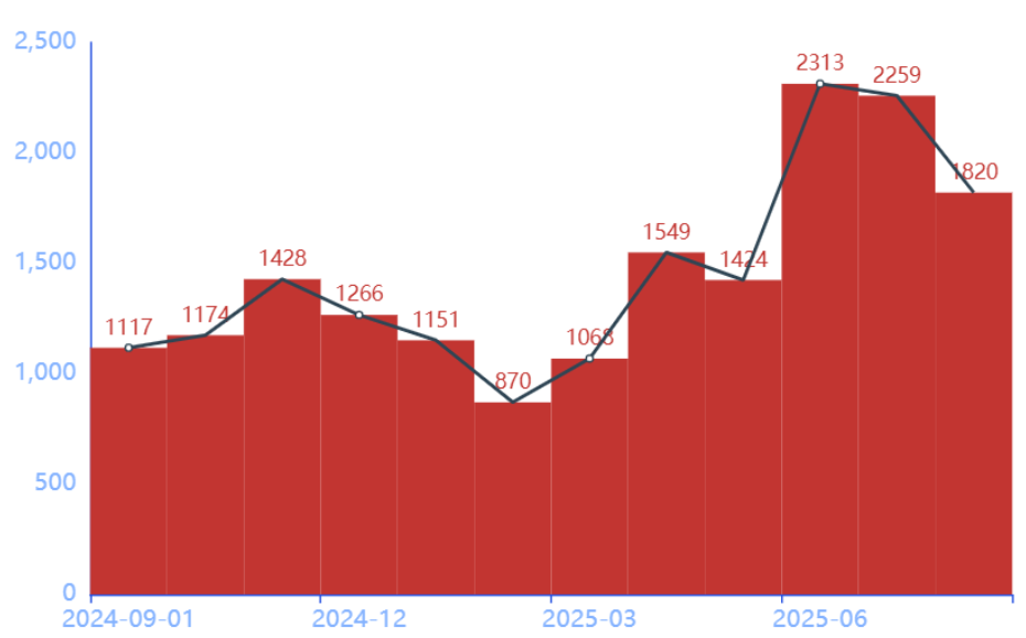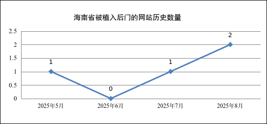 2025年8月,共监测发现我国大陆地区2762个网站被植入后门程序,比上月的4525个下降了38.96%,其中,海南省2个,历史数量如图3所示。