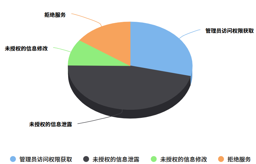 从漏洞引发的威胁来分类,其中未授权的信息泄露占比为46.3%,管理员访问权限获取占比为28.8%,拒绝服务占比为15.1%,未授权的信息修改占比为9.7%,具体情况如图6所示。