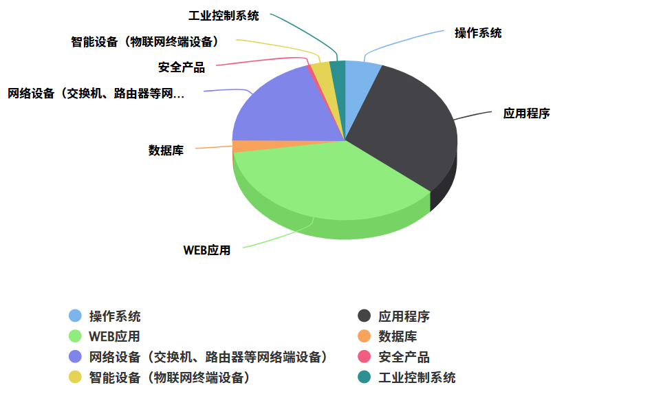 从漏洞影响对象类型来分类,其中影响WEB应用占比为36.4%,影响应用程序占比为30.8%,影响网络设备(交换机、路由器等网络端设备)占比为19.4%,影响操作系统占比为5.4%,以及智能设备(物联网终端设备)占比为2.7%,数据库占比为2.5%、工业控制系统占比为2.1%以及安全产品占比为0.6%等,具体情况如图9所示。