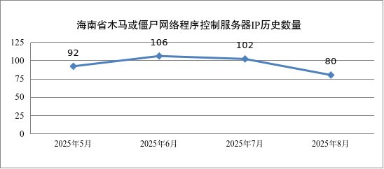 2025年8月,共监测发现我国大陆地区24949个IP地址对应的主机被利用作为木马控制服务器,与上月的25870个相比下降了3.56%,其中海南省的IP共有80个,排全国第27位,占总数的0.32%,历史数量如图2所示。