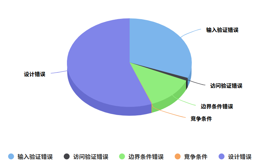 从漏洞产生原因来分类,其中设计错误占比为55.8%,输入验证错误占比为30.7%,边界条件错误占比为12.4%,访问验证错误占比为1.0%,竞争条件占比为0.1%,具体情况如图5所示。