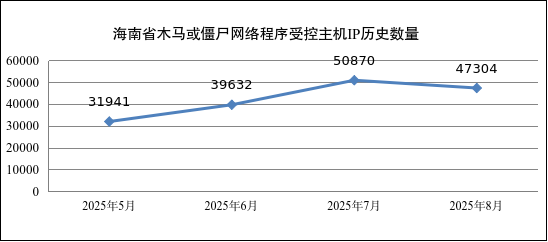 2025年8月,共监测发现我国境内木马或僵尸程序受控制主机数为4508952个,与上月的5370386个相比下降了16.04% ,其中海南省的IP共有47304个,排全国第27位,占总数的1.05%,历史数量如图1所示。
