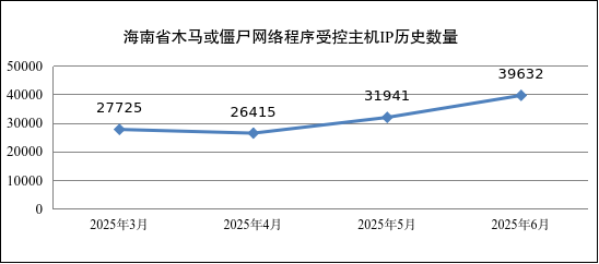 2025年6月,共监测发现我国境内木马或僵尸程序受控制主机数为4482356个,与上月的3786669个相比增长了18.37% ,其中海南省的IP共有39632个,排全国第28位,占总数的0.88%,历史数量如图1所示。