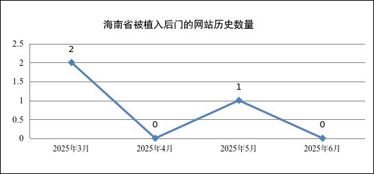 2025年6月,共监测发现我国大陆地区3003个网站被植入后门程序,比上月的2838个增长了5.81%,其中,海南省0个,历史数量如图3所示。
