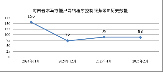 2025年2月,共监测发现我国大陆地区12914个IP地址对应的主机被利用作为木马控制服务器,与上月的12452个相比增长了3.71%,其中海南省的IP共有88个,排全国第27位,占总数的0.68%,历史数量如图2所示。