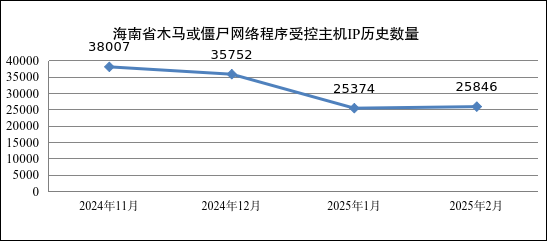2025年2月,共监测发现境内木马或僵尸程序受控制主机数为2898070个,与上月的2940882个相比下降了1.46% ,其中海南省的IP共有25846个,排全国第27位,占总数的0.89%,历史数量如图1所示。